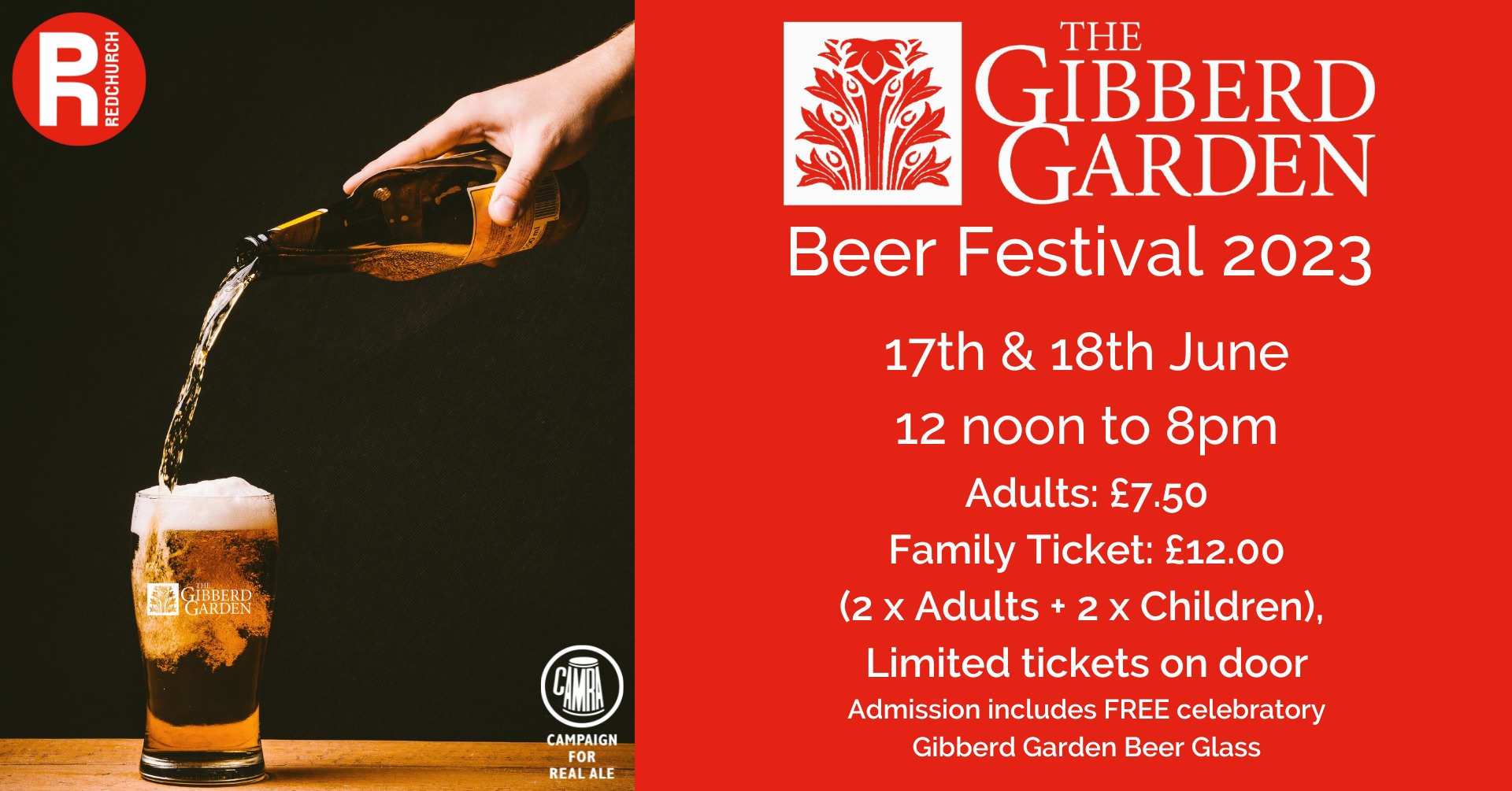 - Family Ticket (Available Sunday Only) £12.00 (2 x Adults + 2 x Children), inc 2 FREE celebratory Gibberd Garden Beer Glasses