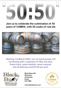 From 1st March onwards (until stocks last), the Black Buoy's 6 handpumps will be serving 50 different real ales. You can see the 6 ales currently on the handpumps via their live 'beer cam', here: http://www.blackbuoy.co.uk/beercam.html