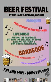 Friday, May 2, 2025 - 12:00pm to Monday, May 5, 2025 - 9:00pm Beer festival, BBQ, bouncy castle, live music Which Pub?: Hare and Hounds